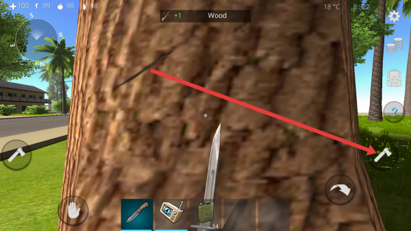 3、点击右侧斧头图标切换工具,对树木进行砍伐操作,获取Wood资源,积累材料,为游戏内建造或制作环节做准备。