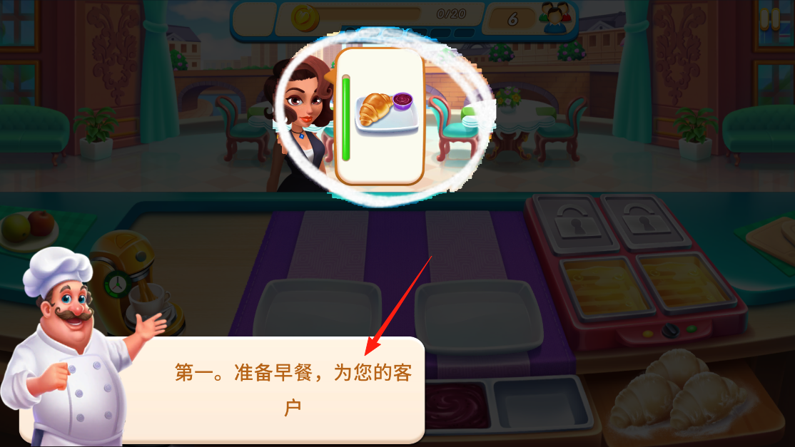 1、厨师给你派活啦,要准备早餐招待客人,先看上方订单提示,清楚客人要的早餐样式,然后去准备对应的食材,开启早餐制作流程。