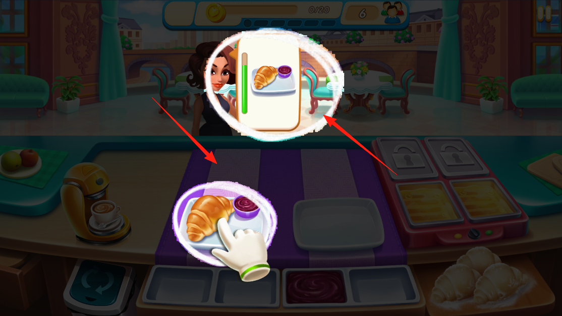 2、食材准备好,按订单提示,把做好的早餐装盘,接着根据指引,把餐品拖到对应的上菜区域,完成这单早餐的配送,让客人拿到美食。