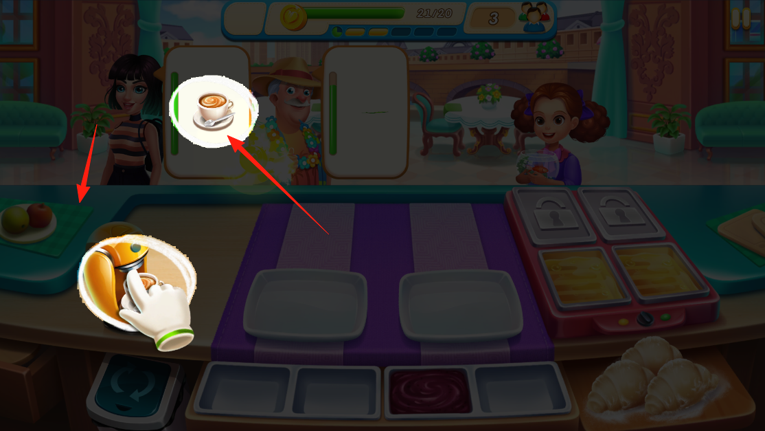 3、又来新订单,这次是咖啡,先看订单要求,找到做咖啡的机器,点击机器开始制作,做好后,把咖啡拖到对应客人那里,完成订单,继续接新活。