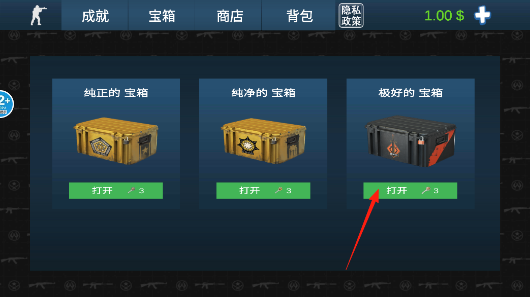 1、在宝箱界面,看到极好的宝箱啦,点它下方打开按钮,消耗3个钥匙,开启宝箱看看能开出啥好东西,说不定有稀有武器或金币。