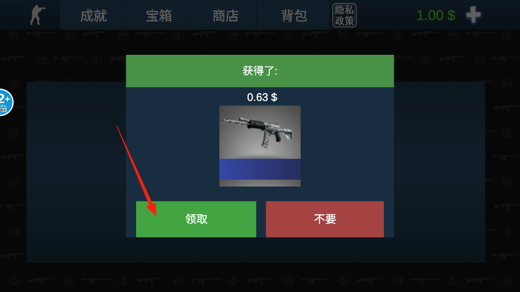 2、开宝箱后弹出奖励界面,显示获得0.63$和一把枪,想把奖励收入囊中,就点领取按钮,把钱和武器存到自己账户,继续开其他宝箱。
