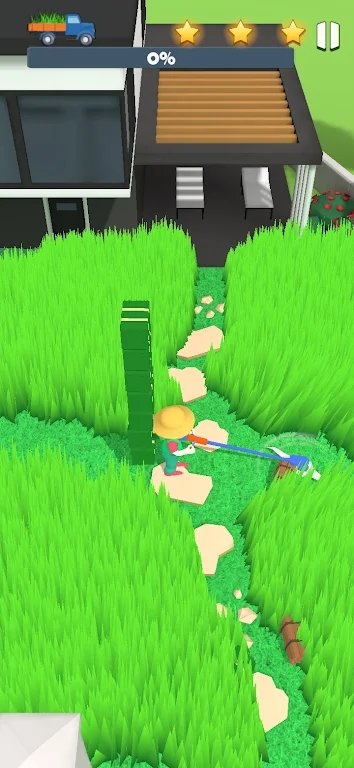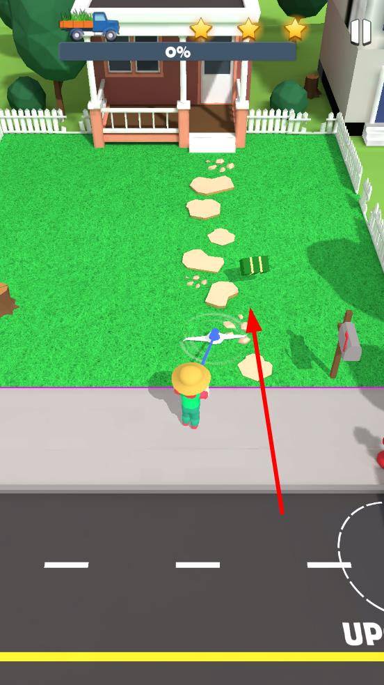 1、进入关卡,操控角色靠近草坪, 除草机会自动切割庭院的杂草,开启正式的清理流程。