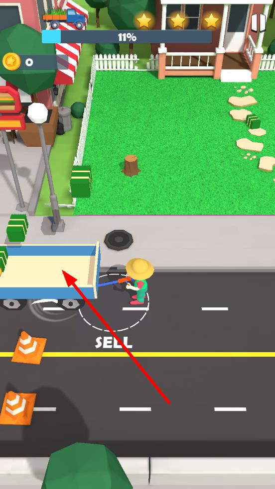 2、清理中优先收集草垛,拖至路边卡车触发售卖,获取金币,也可以收集树桩等物品,但是不要运上车,否则车辆装不下草垛。