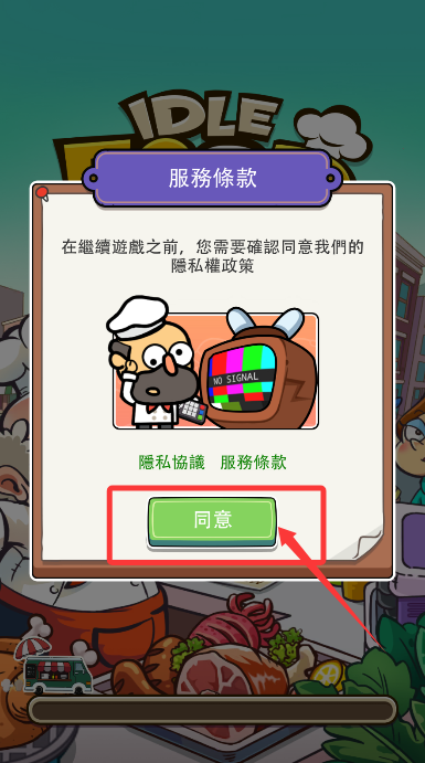 1、初次启动时,阅读用户协议后点击"确认"键,正式进入美食世界。