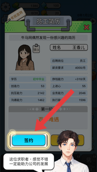 1、根据老板的对话框提示:公司没有员工可不行,可点击座位+号进行招聘新员工。