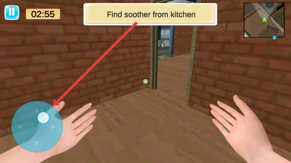3、依据任务提示,通过左侧虚拟摇杆操控角色移动,前往厨房寻找安抚奶嘴,在限时内完成任务推进游戏。