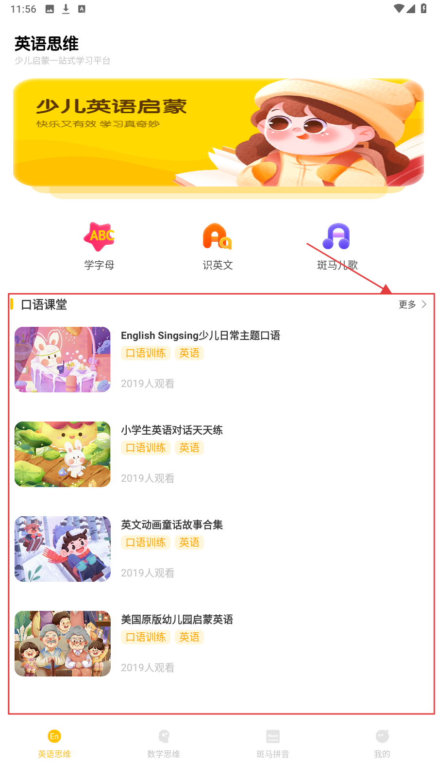 1、进入英语思维页,点口语课堂【更多】,浏览全部英语学习内容。