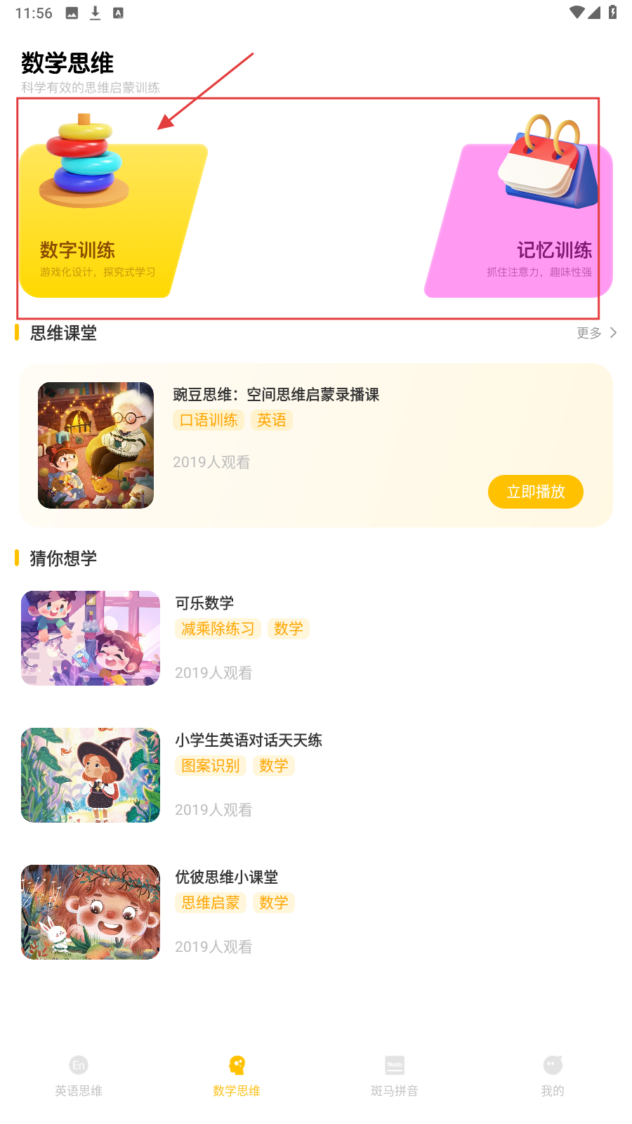 3、切换数学思维页,选【数字训练】,开启数学思维启蒙练习。