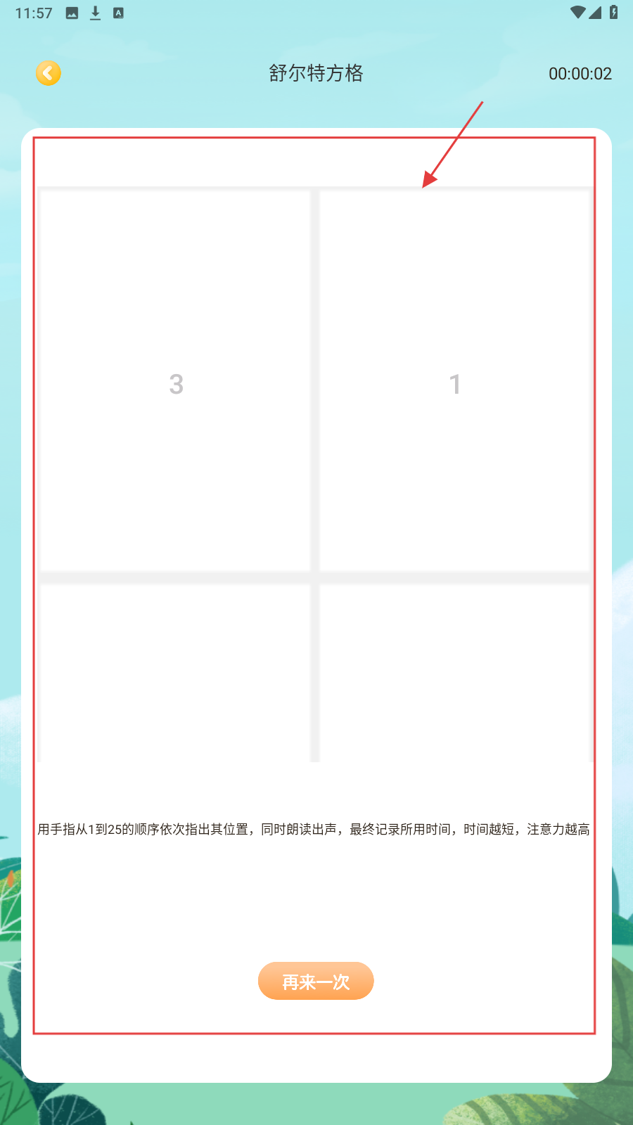 4、进入舒尔特方格,按1-25顺序指认数字,训练注意力。