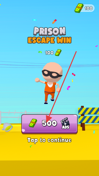3、成功越狱后,界面显示PRISON ESCAPE WIN,点击标有500的按钮,可获得奖励,继续游戏。