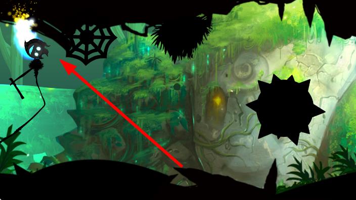 3、操控角色移动,遇到箭头指向的蜘蛛网,用武器破坏,继续在黑暗森林冒险,避开尖刺等障碍。