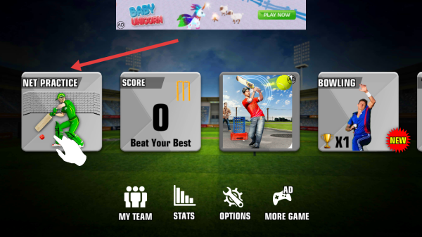 1、点击启动页板球START,进主界面选NET PRACTICE,入体育场网式练习,熟击球,投球基础。