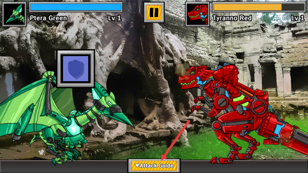2、按Attack Guide的相关指示,释放基本的技能,让绿翼龙机甲的技能命中绿色暴龙机甲,打出伤害。