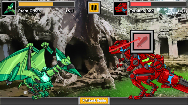 1、战斗开始,点击下方的Attack Guide开始,依据指引锁定敌方Tyranno Red,准备发起首轮的攻击。
