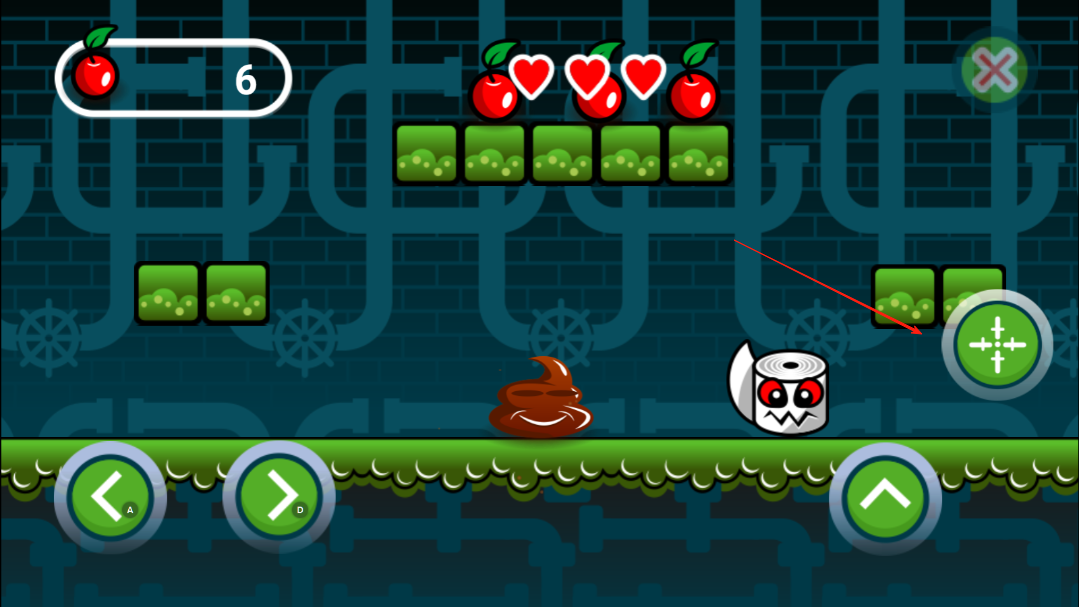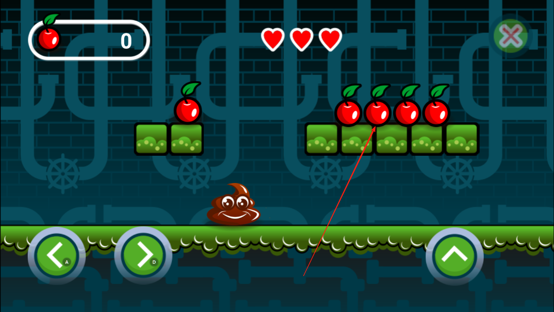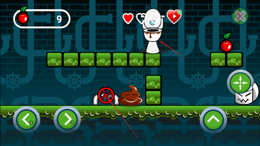 1、操控小粪粪开始前进,让小粪粪吃到苹果,吃到苹果之后,小粪粪将获得攻击键,一个苹果是一发子弹。