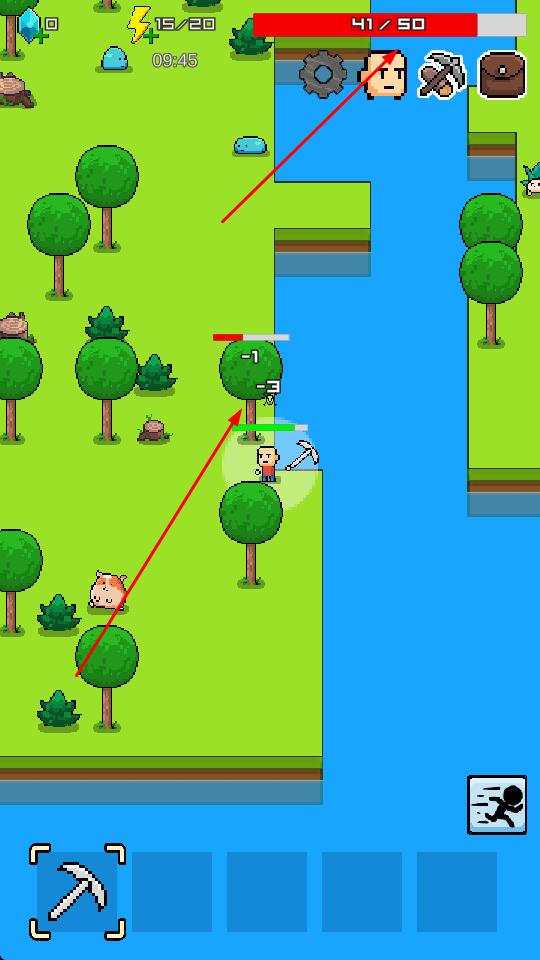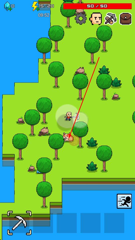 2、游戏过程中,操控角色移动,遭遇粉色怪物时发起攻击,留意顶部血量如50/50与能量闪电标识变化,点击树木,使用斧头砍伐获取资源。