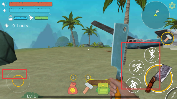 1、在游戏初始场景,利用右侧跳跃、疾跑等动作按钮,操控角色移动,熟悉基础操作,应对海岛环境。