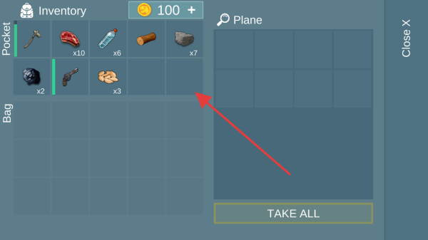 3、打开飞机 inventory 后,查看左侧背包物资,按需点击TAKE ALL或单个拾取,收集资源强化生存能力。
