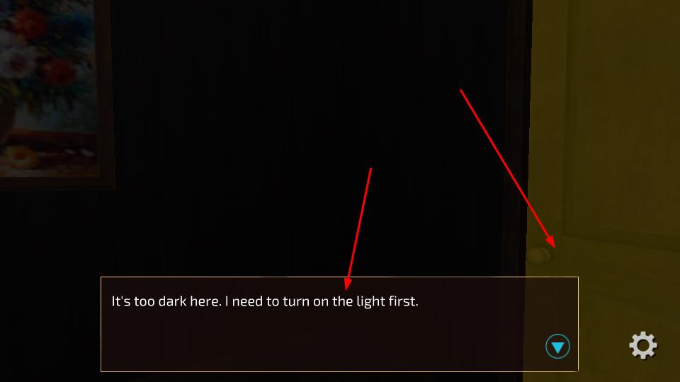 2、场景过暗时依据提示It's too dark here. I need to turn on the light first.,寻找照明装置,定位门旁开关区域。