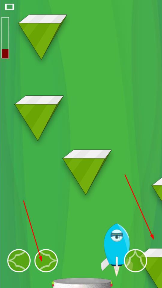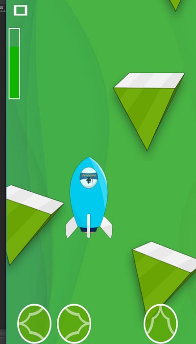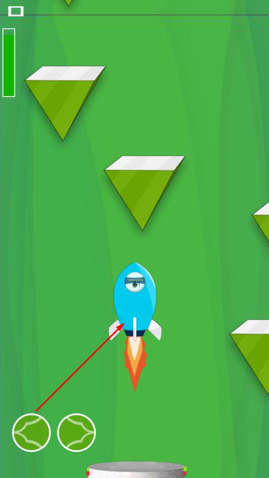 2、游戏过程中,点击底部左右两侧圆形按键,控制火箭左右移动,躲避绿色三角障碍,维持飞行状态。