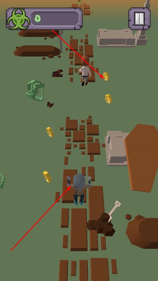 1、需要进入游戏,操控僵尸角色在破碎地形奔跑,沿路径收集金色硬币,留意上方生化进度条变化,开启跑酷挑战。