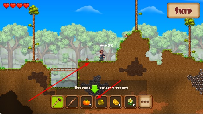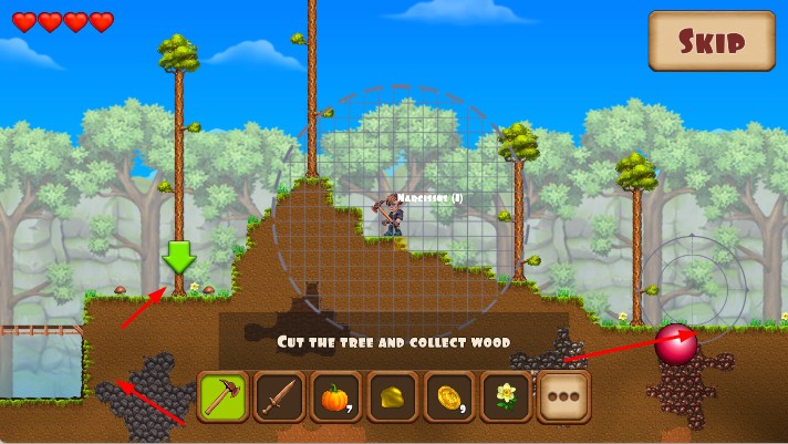 2、在森林场景按任务提示,切换工具砍伐树木、采集石头等资源。