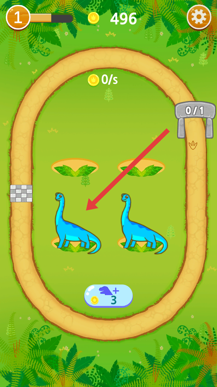 1、进入游戏后,利用这两只相同的蓝色恐龙进行合成更高级的恐龙,熟悉恐龙合成的操作和生产金币的办法。