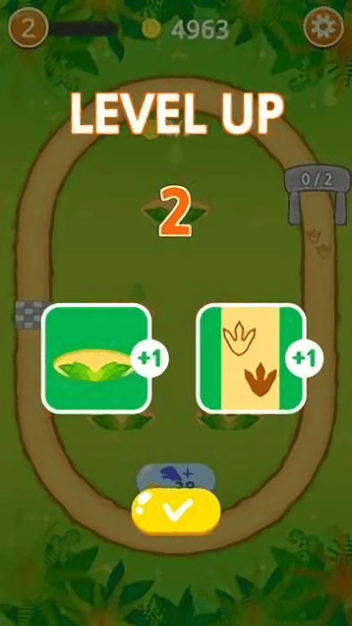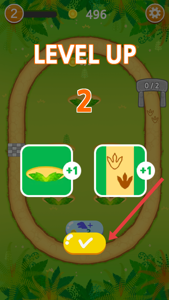 2、升级界面出现LEVEL UP时,选择新增的养殖或跑道设施,点击黄色对勾按钮,完成关卡升级至2级。