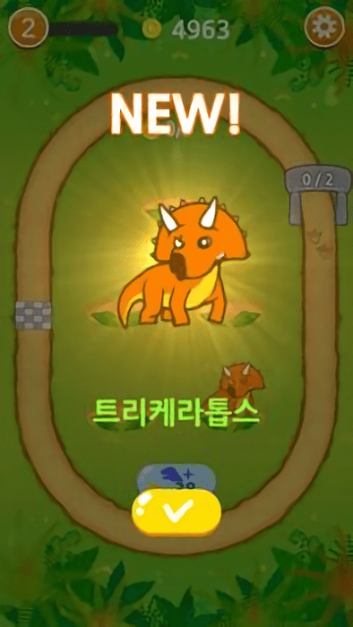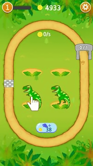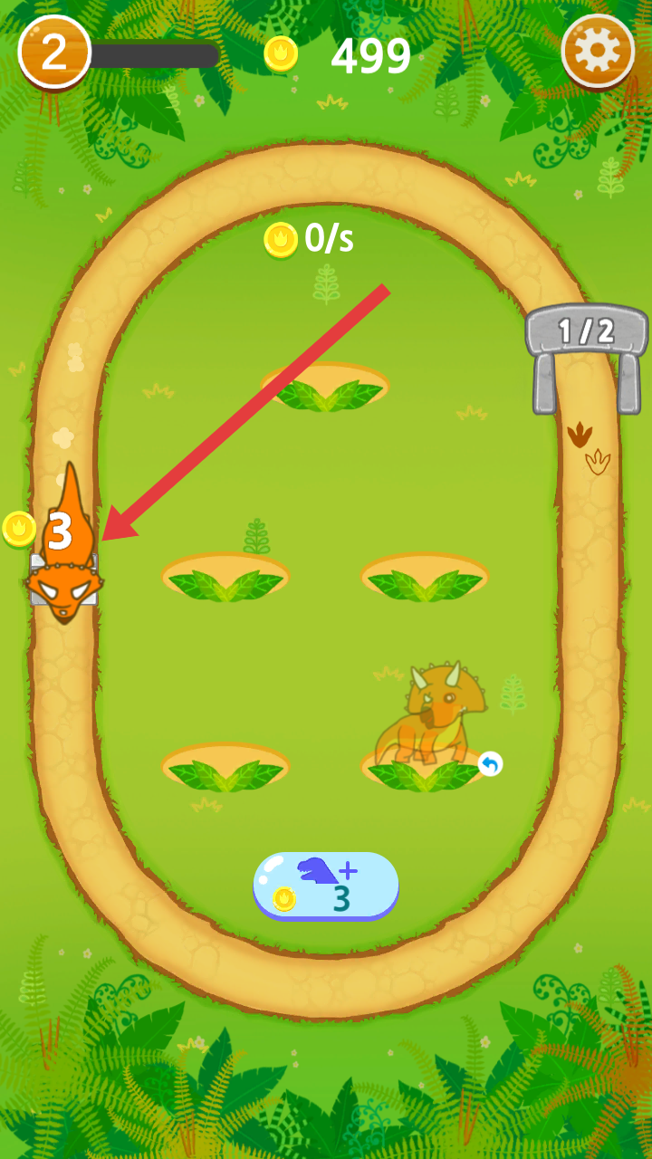 3、把最高等级的橙色恐龙拖动到跑道上,每跑完一圈就能能拿到3个金币,比如现在达成1/2的跑圈目标。