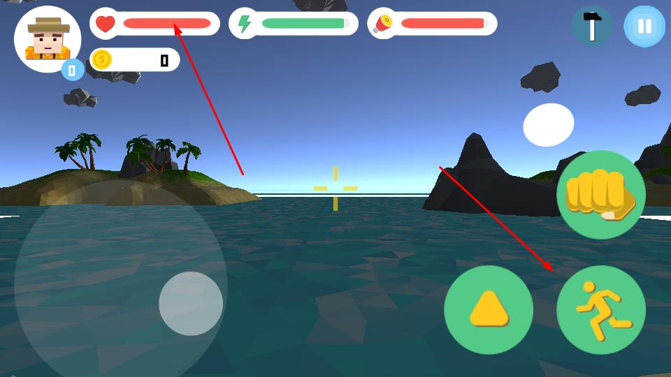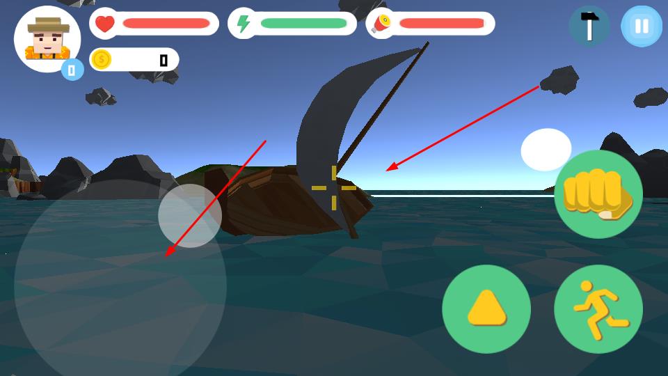 2、左侧虚拟摇杆操控移动,右侧拳头键攻击、三角键跳跃、奔跑键加速,应对沉船等场景,收集资源或处理障碍。