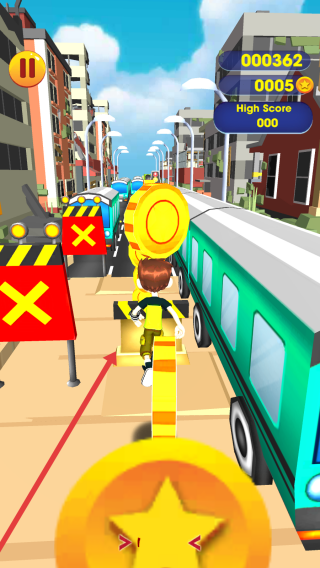 3、跑酷过程中,操控角色在街道收集金币,躲避车辆与路障等障碍,争取提升分数,推进游戏进程。