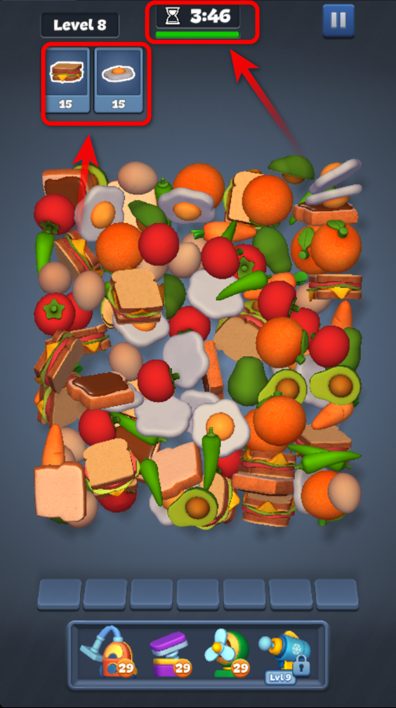 2.点击上方相同的物品移动到下方,如果有三个相同的物品即可进行消除。