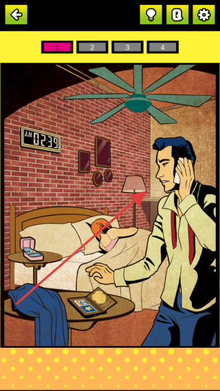 2、在第1关场景房间内,观察角色打电话的互动,留意周围物品时钟、床、桌上物品等,根据箭头指引探索关键线索,推进解谜。