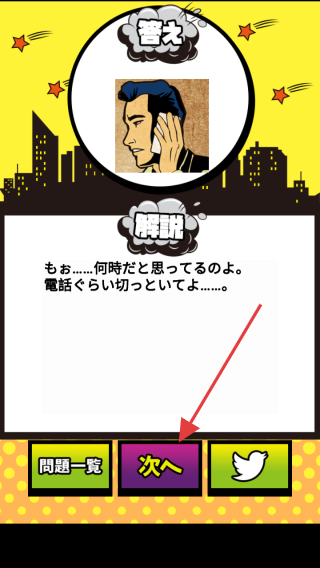 3、完成当前关卡后,出现“答え 解説”界面,阅读“もぉ……何時だと思ってるのよ。電話ぐらい切っといてよ……。”内容,点击次へ按钮,进入下一关继续游戏。