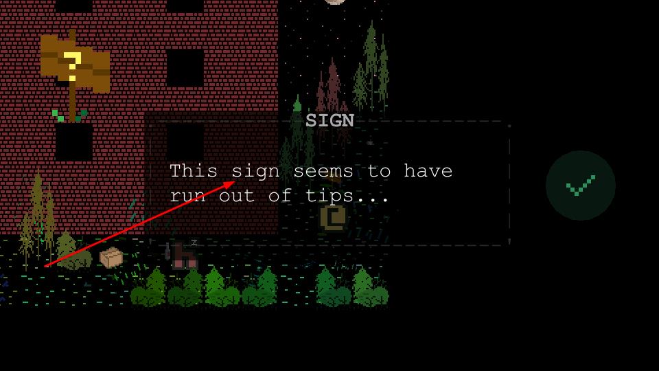 2、操控角色移动互动环境元素如草坪、标志牌,点击黄色问号标志牌,触发文字提示如This sign seems to have run out of tips...,获取线索信息。