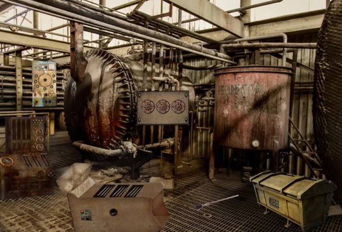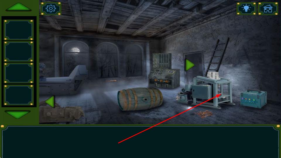 2、进入废弃房间,探索木桶、机械装置等元素,点击互动获取关键道具或提示,推进场景解谜。