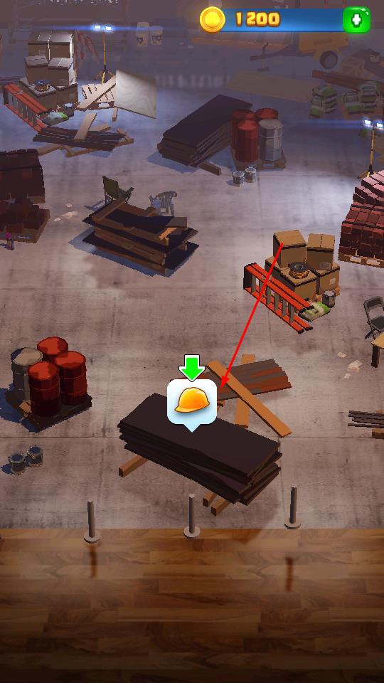 1、在仓库场景中点击标有安全帽图标的物资堆,收集道具,界面顶部金币数值如1200同步更新,积累资源用于后续挑战。