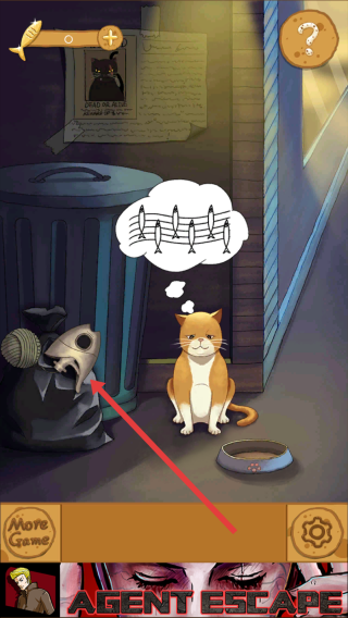 3、在游戏场景中,点击垃圾桶旁垃圾袋里的鱼骨头,触发互动剧情,推进关卡进程。