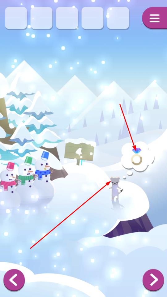 2、探索雪地场景时,留意狐狸头顶的想法气泡如戒指图案,互动场景内的雪人、标识牌等元素,收集解谜所需的线索与道具。