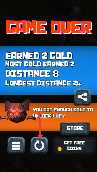 3、游戏结束后,查看本次收益,点击界面中间带循环箭头的按钮,重新开始挑战,积累金币以解锁新角色Lucy。