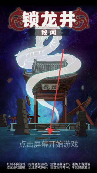 1、进入锁龙井秘闻游戏初始界面,点击屏幕下方点击屏幕开始游戏文字区域,开启游戏冒险。