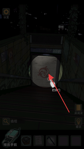 3、在场景中,找到带有图案的卷帘门,点击打开门交互选项,使用撬棍等道具开启门,探索新区域。