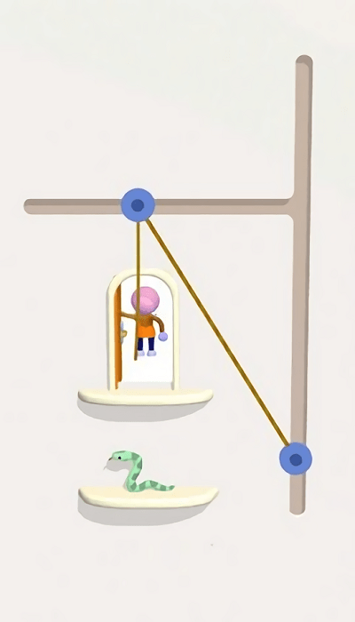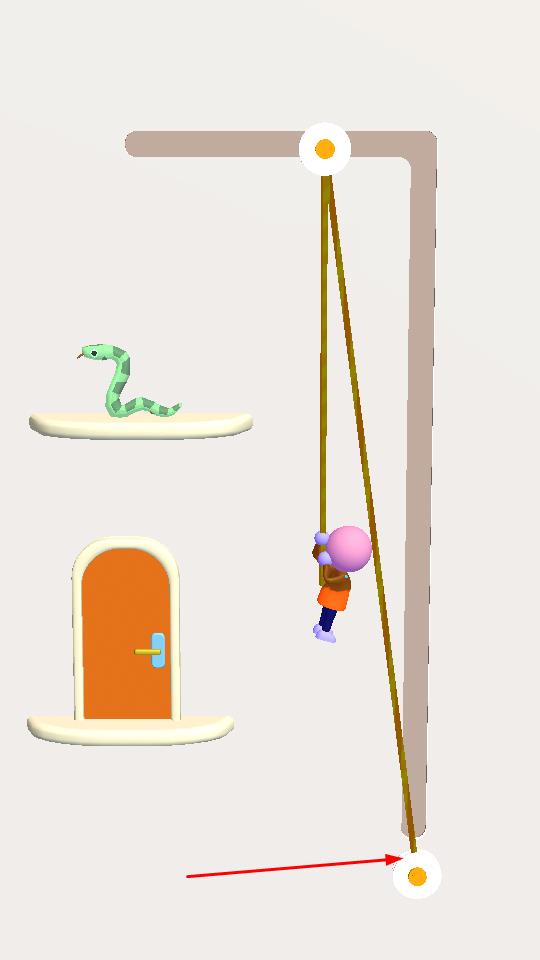 2、操控绳索的绕向与松紧,引导角色安全攀升,避开蛇的威胁,然后就可以最终抵达橙色门所在的平台区域。