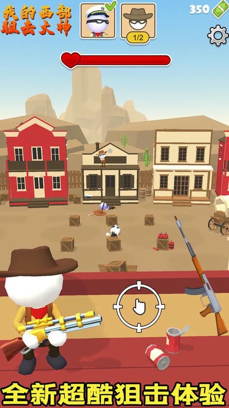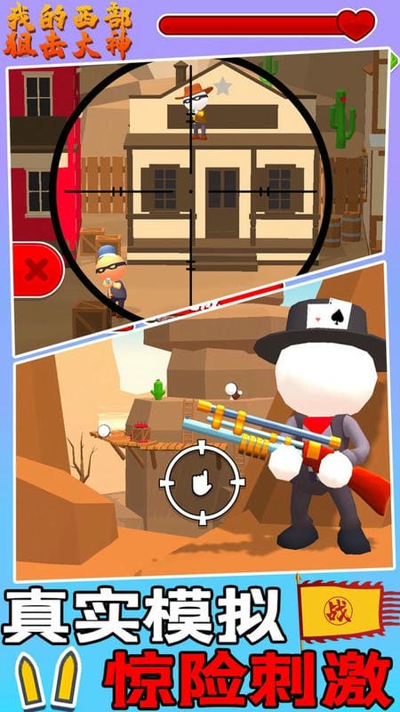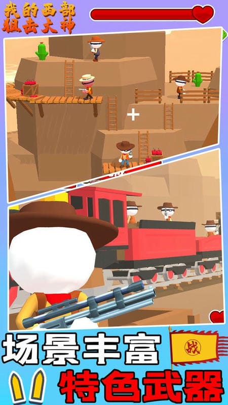 我的西部狙击大神是一款以西部牛仔为主题的卡通风格FPS射击游戏,将化身为沙漠城镇中的西部牛仔,在充满西部风情的场景中执行各类任务挑战,玩法丰富多样,你需要熟练使用左轮手枪、狙击步枪等武器,在小镇的街巷、酒馆、驿站等地点与敌人展开激烈对抗,消灭目标完成任务。