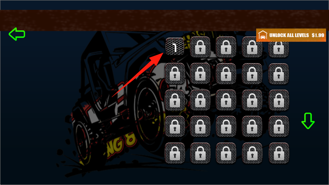 1、点击屏幕中央的位置按钮,进入游戏,操控绿色拖拉机开始越野驾驶挑战,点击选择关卡。