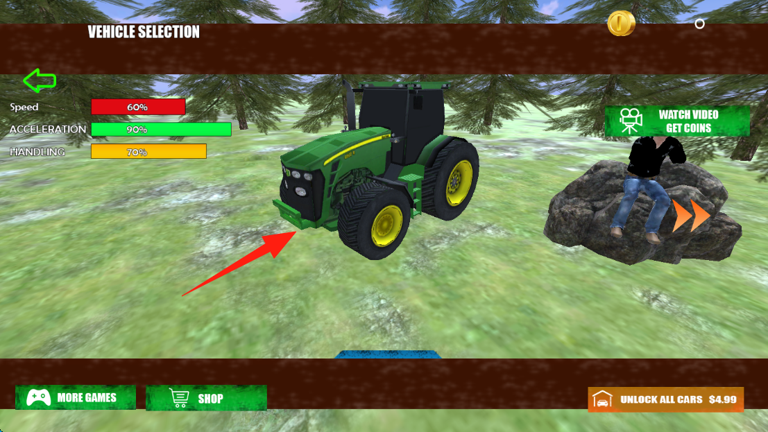 2、在车辆选择界面,确认绿色拖拉机的速度、加速度、操控等属性后,点击拖拉机进入游戏。