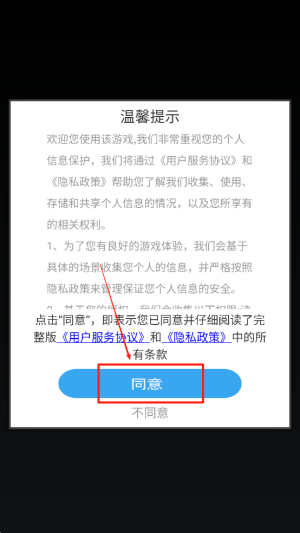 1、接受协议:在游戏启动时,阅读并点击“同意”按钮以接受用户协议和隐私政策。