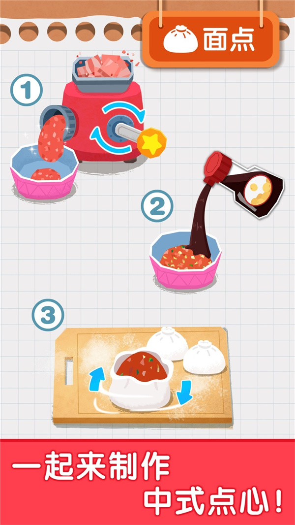 接着制作皮薄馅大的中式面点:肉包,这可充分考验宝宝的小手灵活度。