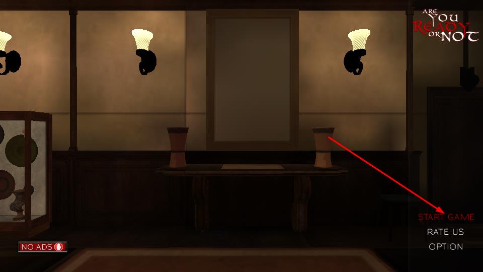 1、点击右侧START GAME选项,进入室内场景,开启限时探索挑战,界面同步呈现RATE US、OPTION功能入口。